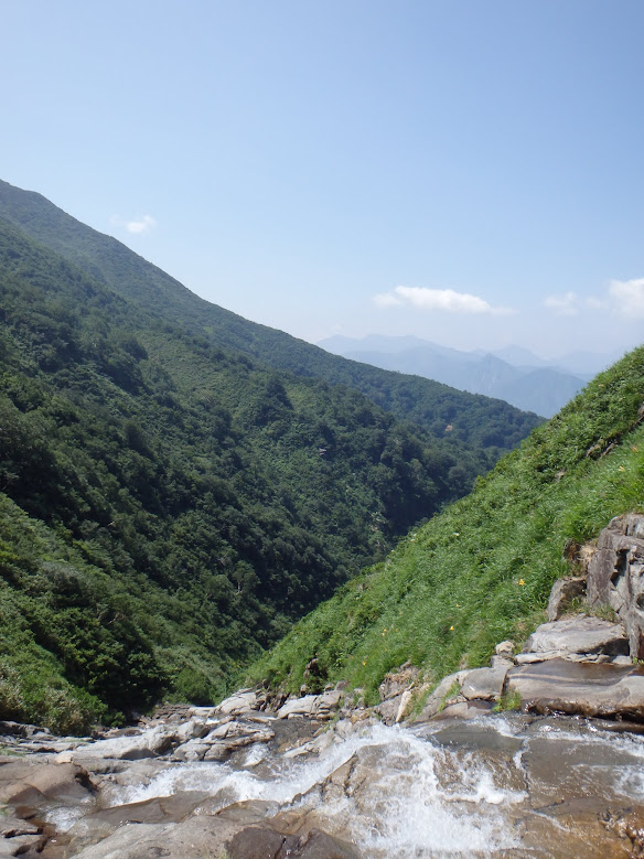 左右の草原が優しく揺れ、傾斜も緩やかになった沢をヒタヒタ行くと、二俣に辿り着きます。右俣は入ってはいけませんとトラロープが張ってあります。「何故にそんなにダメなのかな、秘密基地の入り口でもあるのかな。」とかなんとか勝手な事を言っていましたが、植生保護だそうです。そう、地球に遊ばせて頂いてます。地球ありがとう。