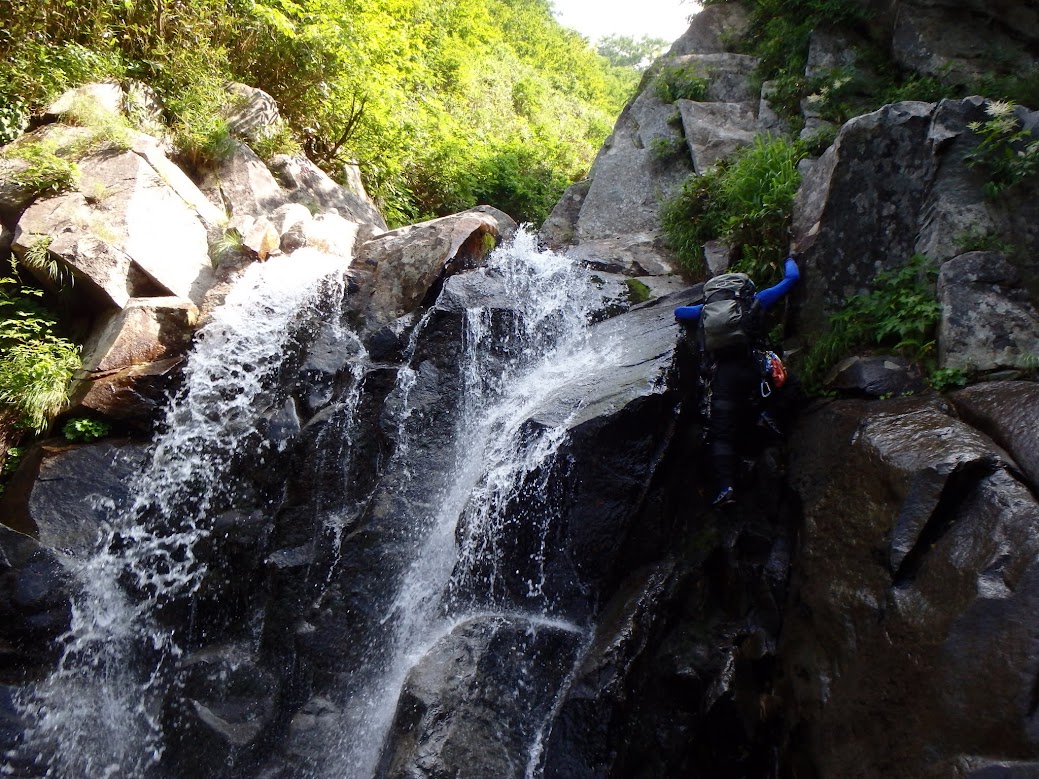 その後は、スケールの大きな沢にとても快適な遡行。練習も兼ねて2箇所ほど、ロープを出しました。