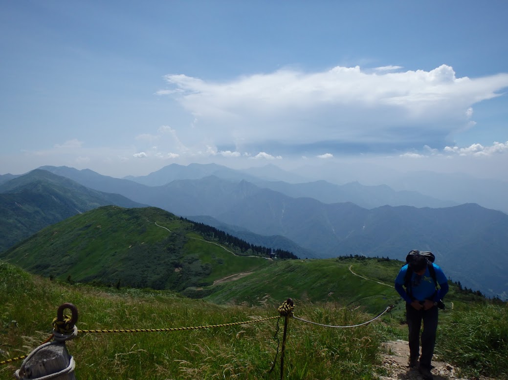 振り返れば山々が連なり、開放感たっぷりです。雄大にして美しい景色に、先を急ぐのも勿体ないので、寝転がったり、歌とか口ずさんでしまったり。
