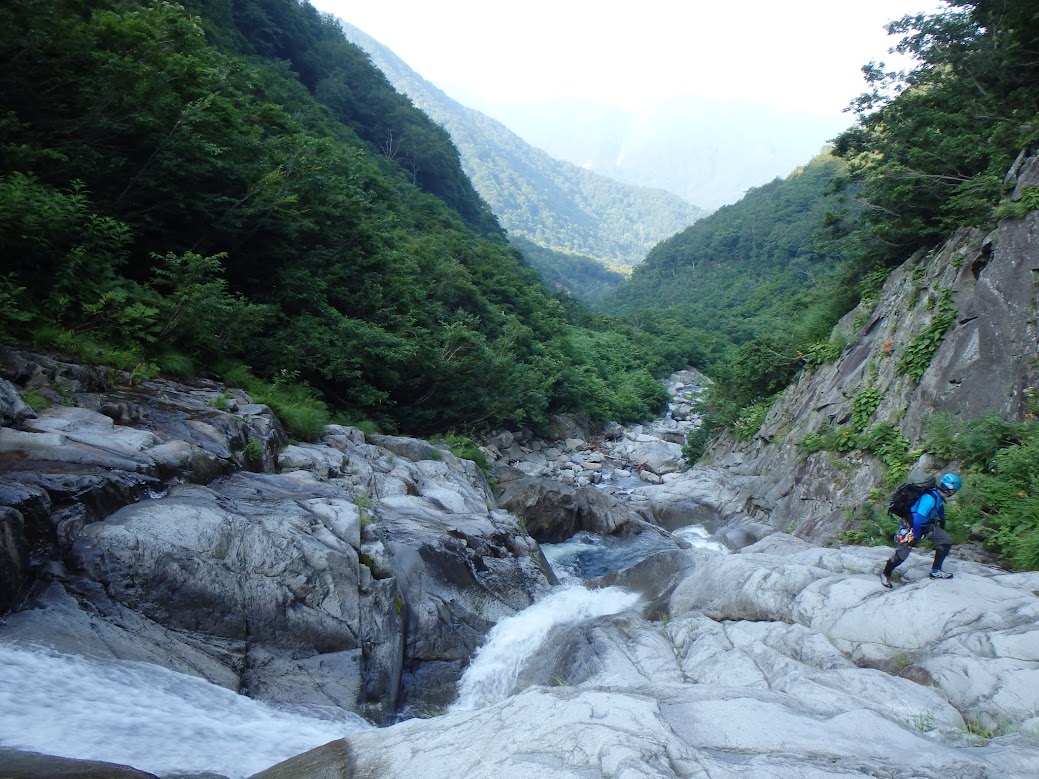 昨年からデビューしたステルスソールの沢靴が、磨かれた、傾斜の緩やかなスラブにピタッとフィットします。しかし、水流脇のヌメヌメでは注意しないと足をすくわれることも。乾いたところ、水流の中のヌメリが剥がされたところを繋ぎながら、沢歩きを堪能します。