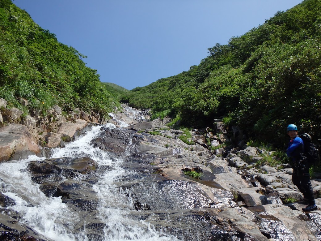 米子沢のゴルジュ帯は、短いものでしたが、威圧感もなく、明るい雰囲気。登れる滝を多くかけ、楽しく越えていけます。