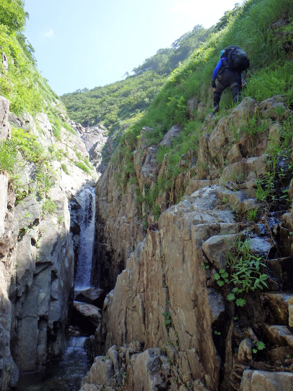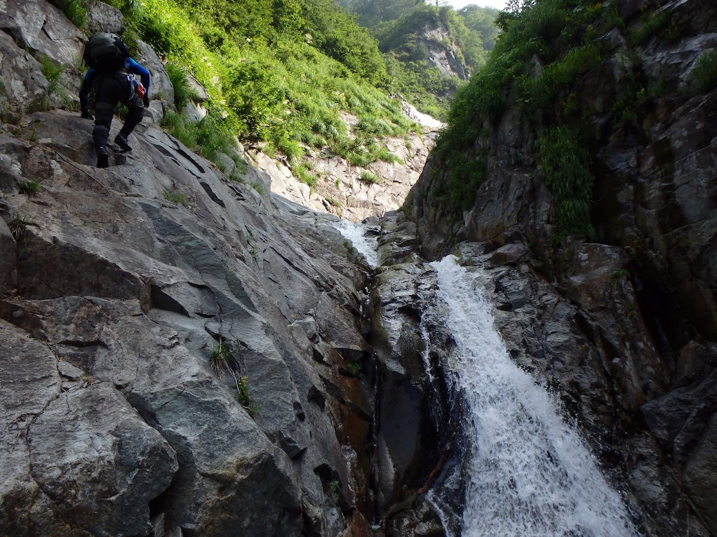 米子沢のゴルジュ地帯の入口となる滝は、右から取付き、上部をトラバース。